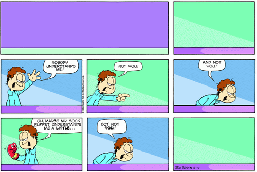 I’ve mentioned it here before, but garfieldminusgarfield.net is beautiful poetry to me. It’s nothing more than Photoshop magic, removing Garfield’s image and dialogue from every pane. This has the marvelous effect of making John Arbuckle look even more like a guy who should never have moved out of his Mom’s basement.
