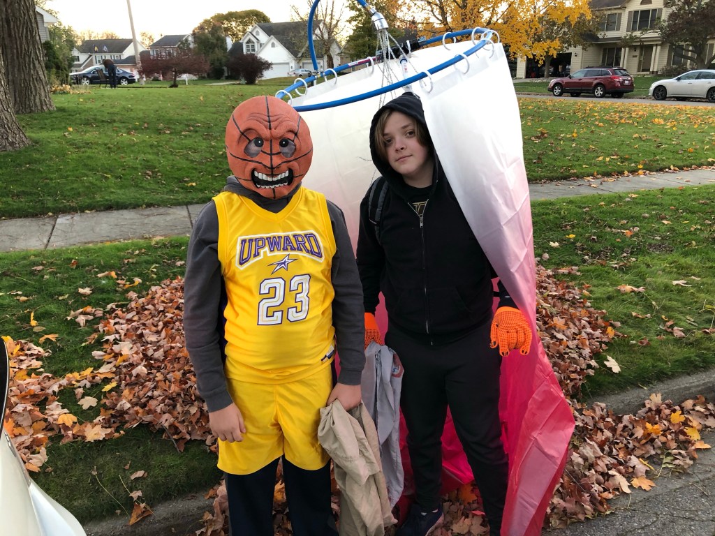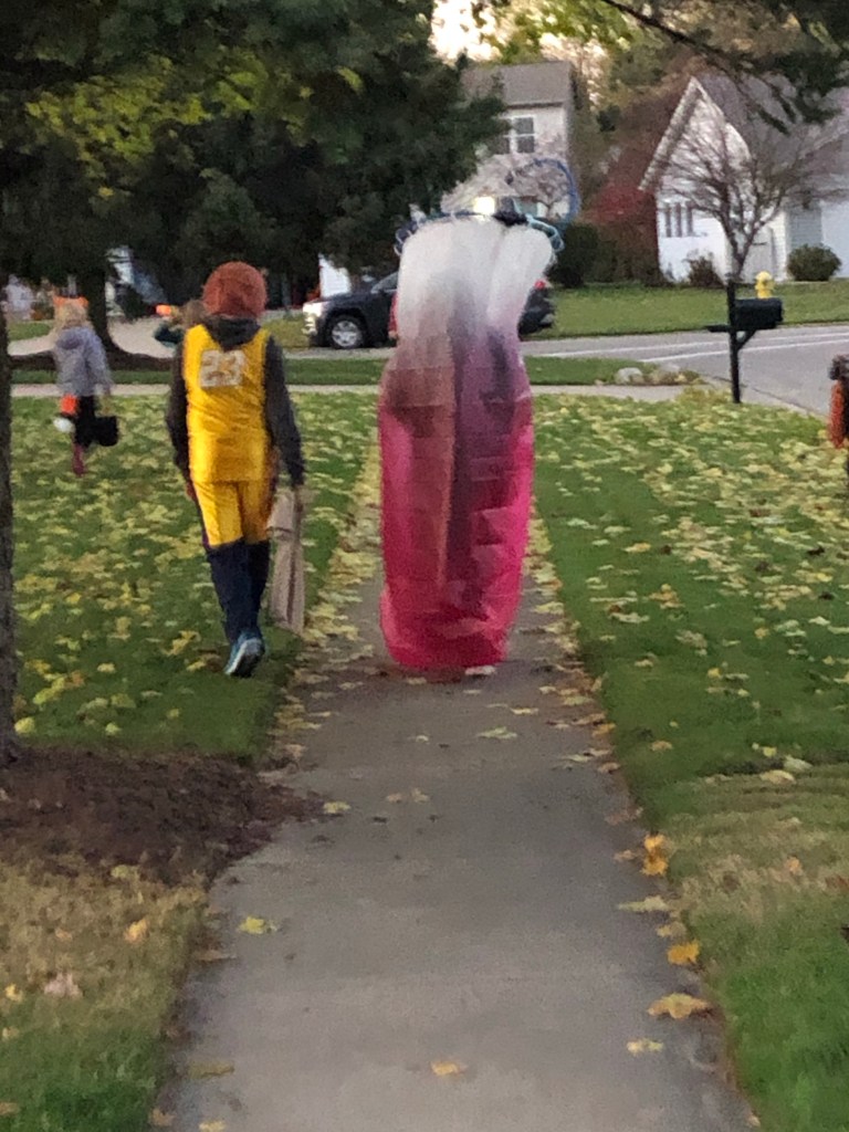 After a customary cruise in the car with Lexi to to see if there are any trains, I took Zac and his pal out for the tricking and treating. Surely this year was different, with less than half the porch lights lit, but others compensated with full size candy bars and copious praise upon recognizing Zac’s costume.